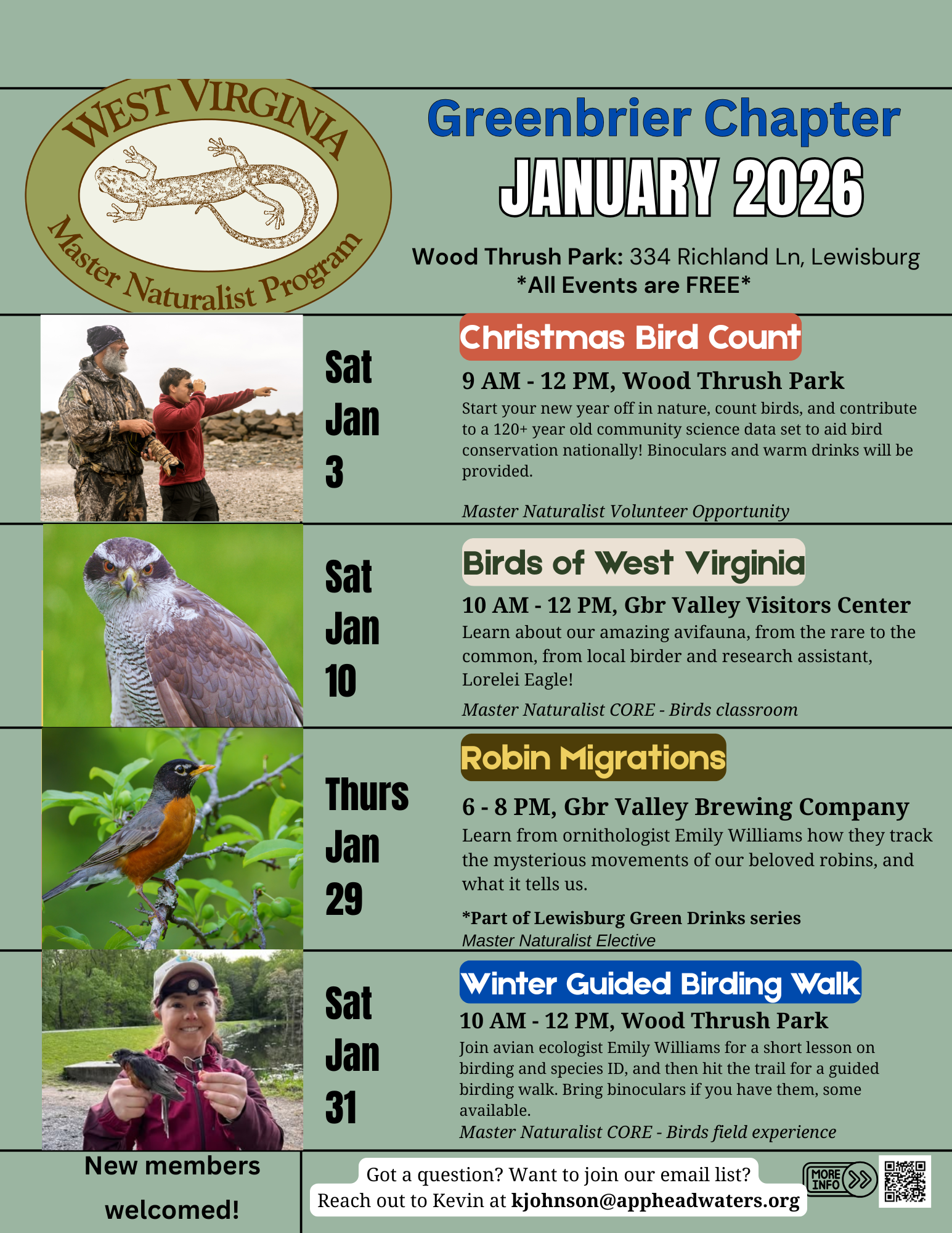 1/31/2026– Winter is for the Birds: Talk and Guided Birding Walk with Ornithologist Emily Williams. 10AM-12PM Wood Thrush Park 334 Richland Lane, Lewisburg WV