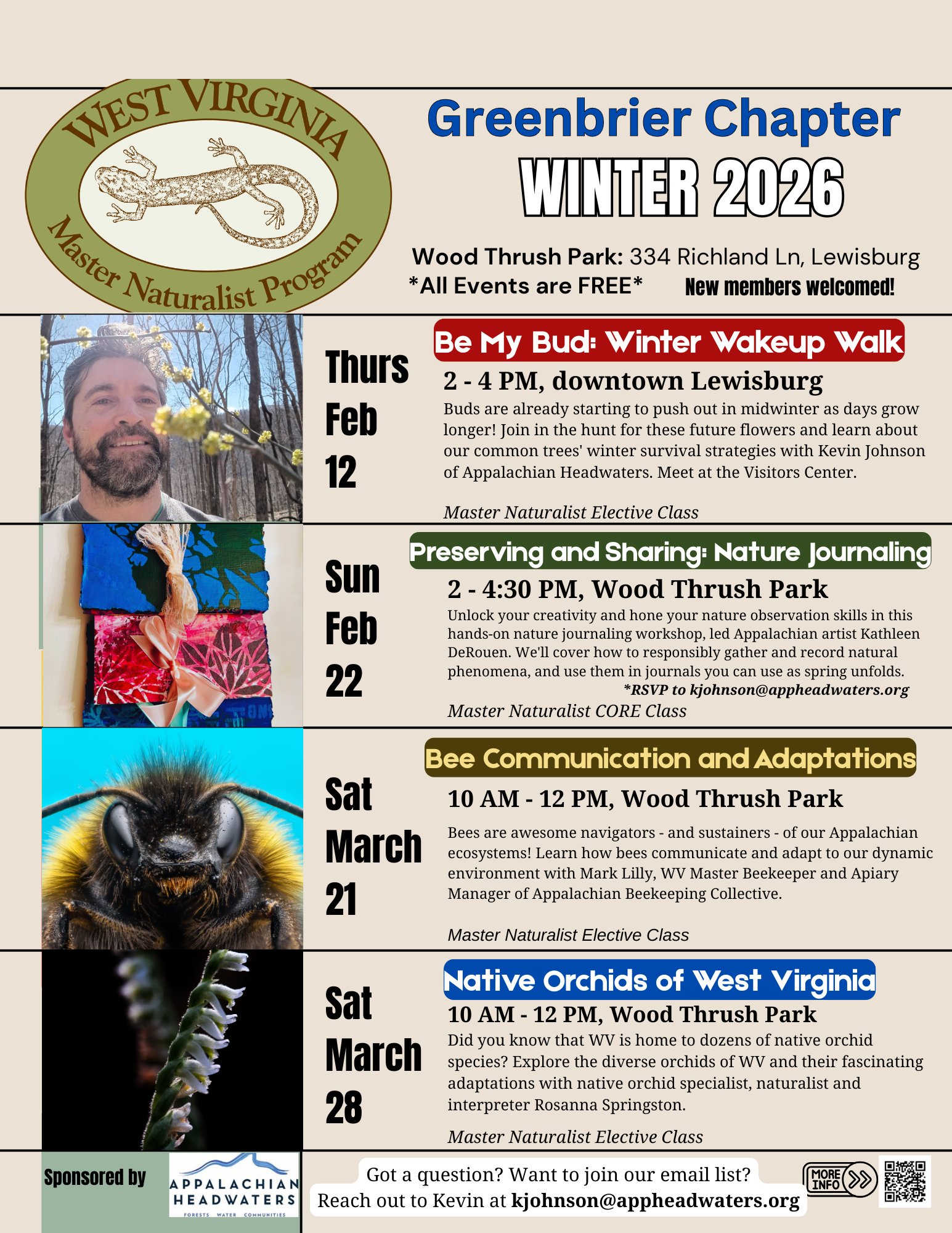 Master Naturalist Classes, also open to public participation–Everyone is Welcome! Email kjohnson@appheadwaters.org to get on the Master Naturalist course email list.